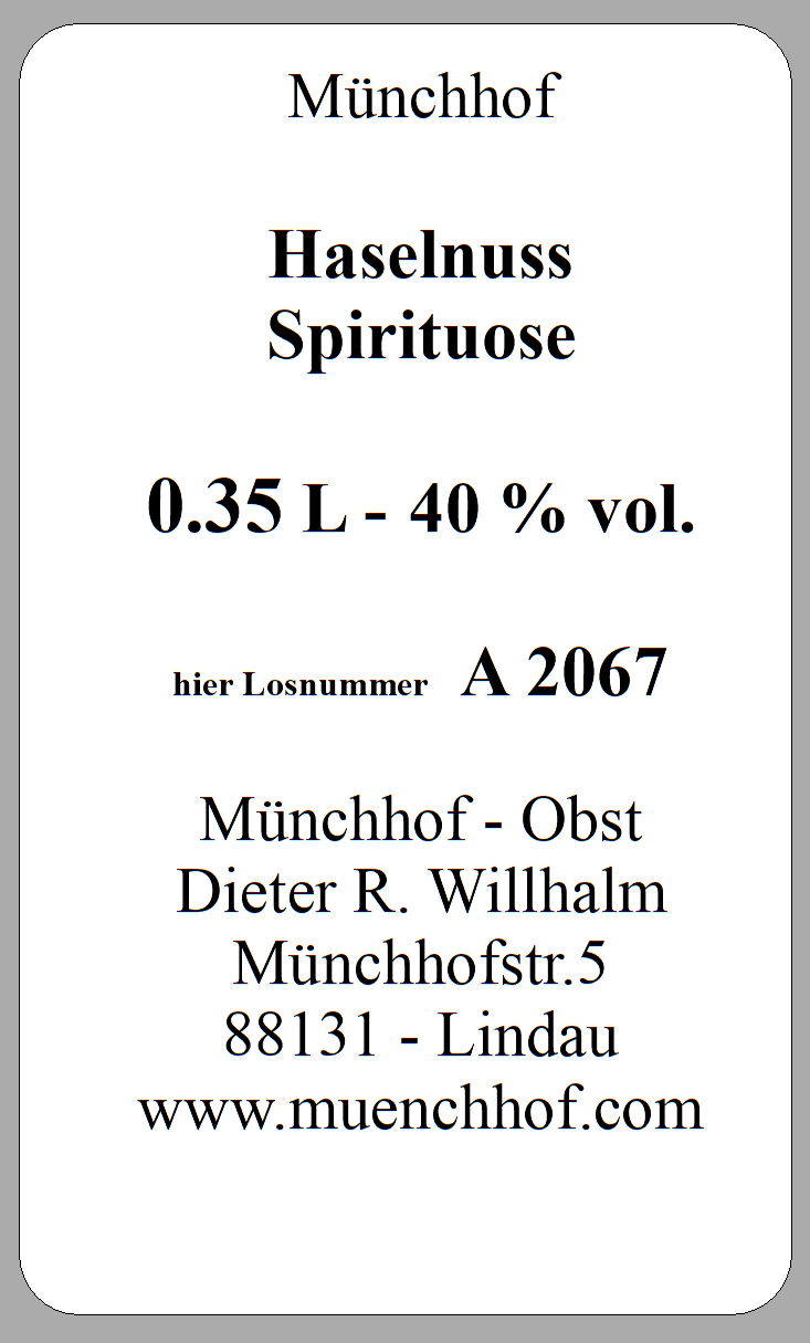 Diese feine Haselnuss - Spirituose stellen wir in unserer hauseigenen Brennerei nach unserem altbewährten Rezept her. Aromatisier mit feinsten Aromen, die aus Haselnussöl gewonnen werden, besticht diese Spirituose mit feinen Nuss- und Schoko - Aromen. Seine leichte Süße macht diese Spezialität zu einem besonders milden Genuss. Angaben / Kennzeichnungspflicht : Inhalt : 0.35 Liter