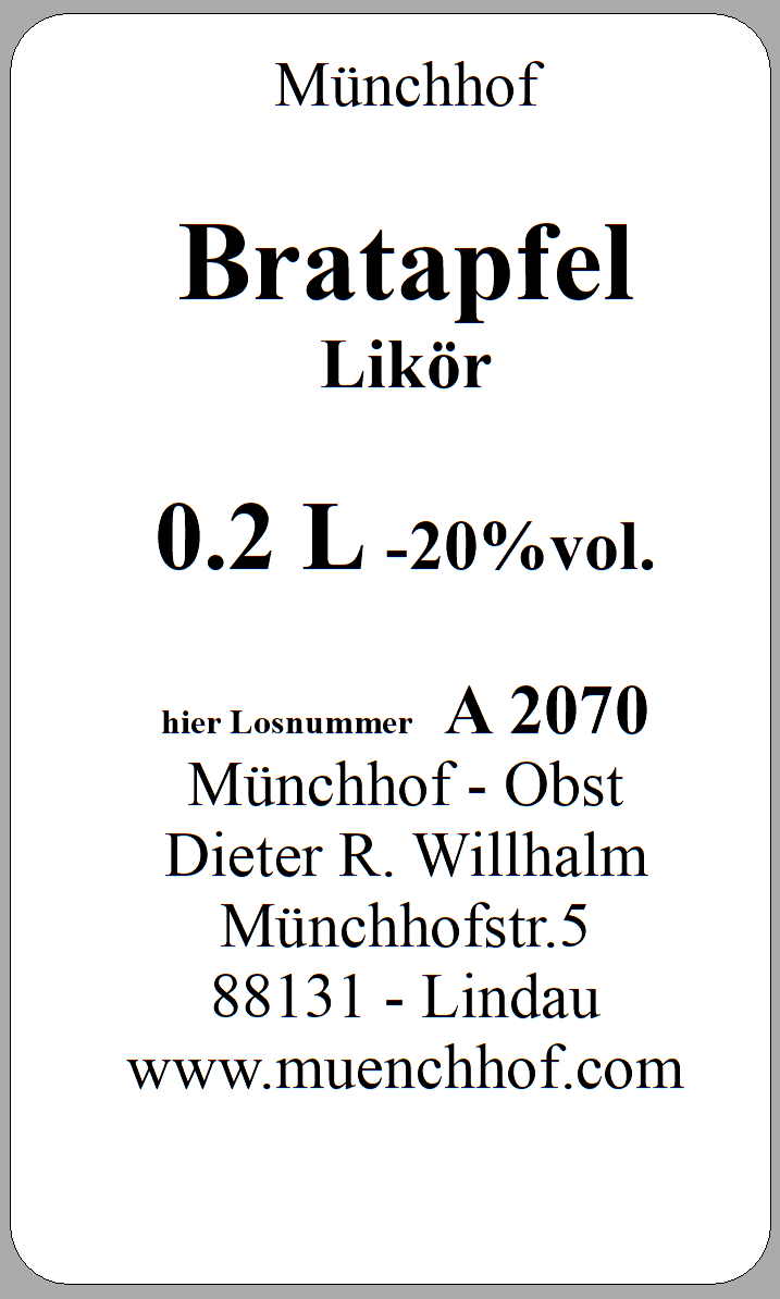 Wir stellen unseren Bratapfel - Likör aus frischen Äpfeln her. Die Äpfel werden in eisernen Pfannen über offener Flamme goldbraun gebacken und mit Karamellzucker und feinen Gewürzen wie Zimt und Vanille verfeinert. Aus diesen gerösteten Äpfeln entsteht nach unserem Hausrezept ein fein fruchtiger Likör mit zarter Zimtnote. Ein besonderer Genuss für die kalte Jahreszeit. Angaben / Kennzeichnungspflicht : Inhalt : 0.2 Liter
