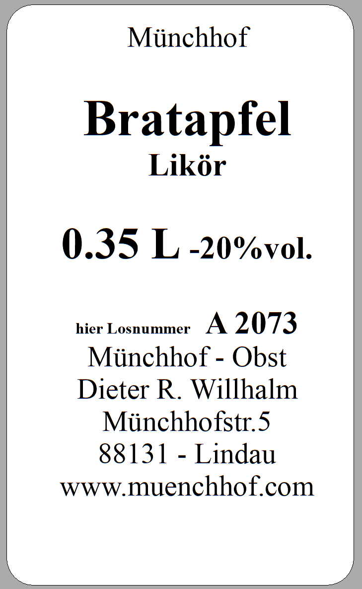 Wir stellen unseren Bratapfel - Likör aus frischen Äpfeln her. Die Äpfel werden in eisernen Pfannen über offener Flamme goldbraun gebacken und mit Karamellzucker und feinen Gewürzen wie Zimt und Vanille verfeinert. Aus diesen gerösteten Äpfeln entsteht nach unserem Hausrezept ein fein fruchtiger Likör mit zarter Zimtnote. Ein besonderer Genuss für die kalte Jahreszeit. Angaben / Kennzeichnungspflicht : Inhalt : 0.35 Liter